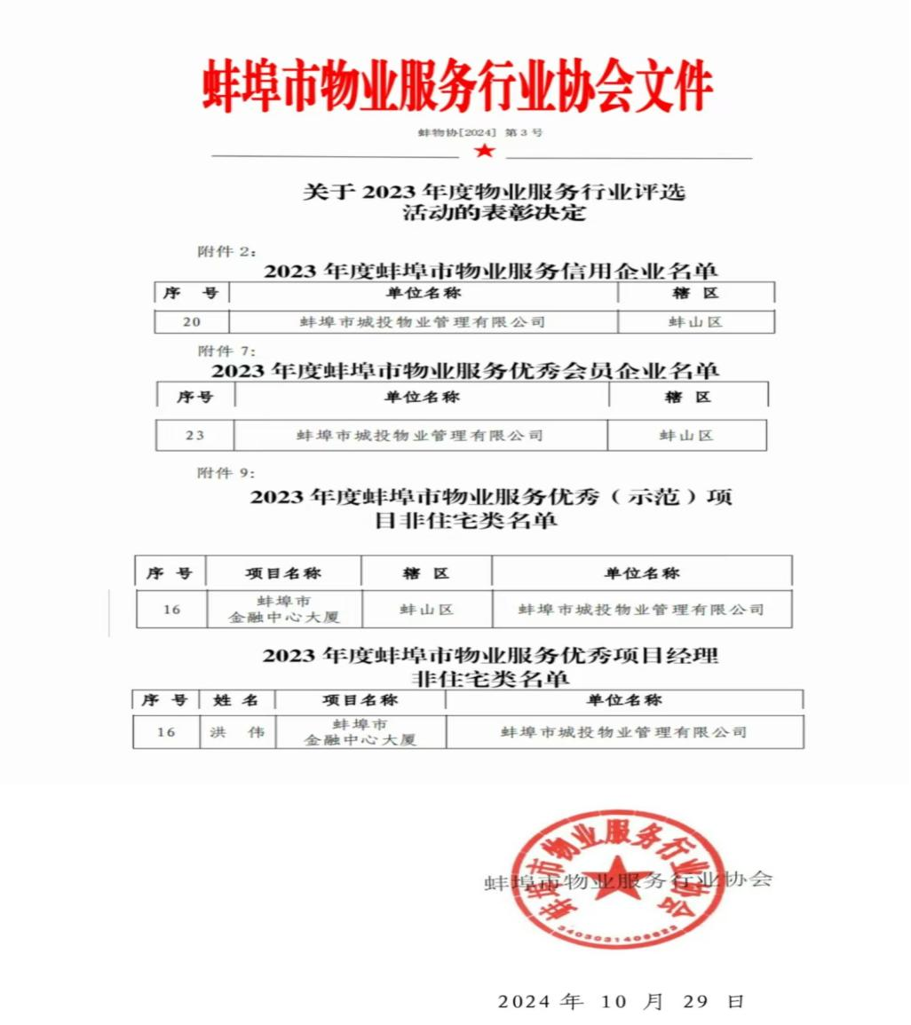 城投物業(yè)公司喜獲2023年度蚌埠市物業(yè)服務(wù)信用企業(yè)等榮譽(yù)稱號(hào)